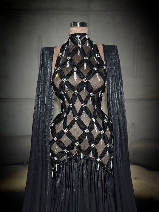 • Long gown featuring a black lattice cage design embellished with shimmering crystal details